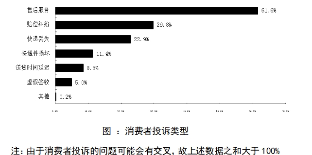 此外,大數(shù)據(jù)顯示售后服務(wù)是消費者投訴較集中的問題。通過大數(shù)據(jù)分析,消費者對快遞售后服務(wù)投訴主要集中在快遞丟失、快遞件損壞、虛假簽收、送貨時間延遲和賠償糾紛這幾個方面。通過數(shù)據(jù)分析發(fā)現(xiàn),當(dāng)前投訴較為集中的是售后服務(wù)(61.6%),其后依次是賠償糾紛(29.8%)、快遞丟失(22.9%)、快遞件損壞(11.4%)、送貨時間延遲(8.5%)、虛假簽收(5.0%)和其他(0.2%)。