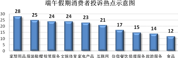2018年端午假期,東方網(wǎng)記者從上海市工商局12315中心獲悉,端午假期共受理消費(fèi)者投訴舉報(bào)412件(投訴385件、舉報(bào)27件),解答各類咨詢201件,其中線上消費(fèi)投訴占投訴總量61%,家居用品(28件)、服裝鞋帽(25件)、租賃服務(wù)(24件)、文化娛樂(lè)和體育服務(wù)(24件)、家電產(chǎn)品(23件)等投訴量居前。