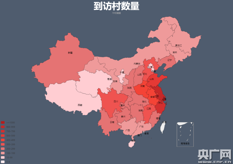 2008到2017年,上財師生累計在各省走訪村莊的分級顯示圖(顏色越深代表所到訪的村莊數量越多)