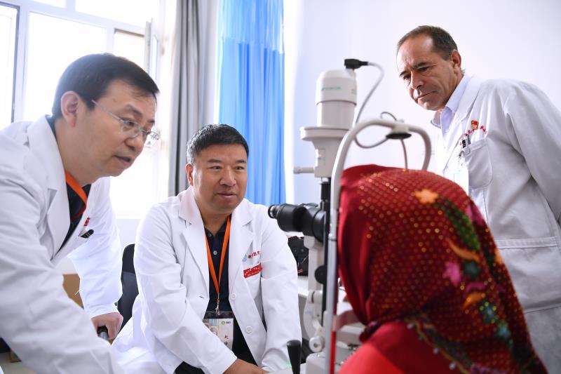 100多名當(dāng)?shù)匕傩罩孬@光明,兩天內(nèi),已為714名患者義診,其中116名患者手術(shù)后重見光明,3天后獲義診病人達(dá)879例,141名患者重見光明。78歲的艾沙汗大娘坐了8小時車來到塔縣,胸前別著黨徽的68歲的鐵里木汗和49歲的鐵米爾……手術(shù)室外的門診擠滿做完白內(nèi)障手術(shù)來復(fù)查的人。醫(yī)院醫(yī)生護(hù)士們拉著醫(yī)療隊(duì)的醫(yī)生和志愿者們?nèi)ゼ依镒隹,人們只要看見穿白大褂的志愿者們便會停下來,專程相送?/font>