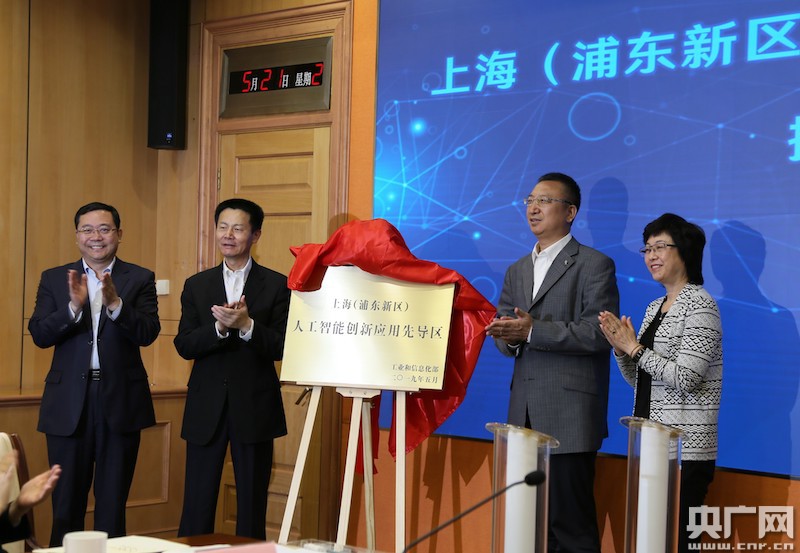 工業(yè)和信息化部總經(jīng)濟(jì)師王新哲、上海市副市長(zhǎng)吳清、工信部科技司司長(zhǎng)胡燕、浦東新區(qū)常務(wù)副區(qū)長(zhǎng)姬兆亮、出席并共同為“上海(浦東新區(qū))人工智能創(chuàng)新應(yīng)用先導(dǎo)區(qū)”揭牌。(央廣網(wǎng)發(fā) 上海市經(jīng)信委 供圖)