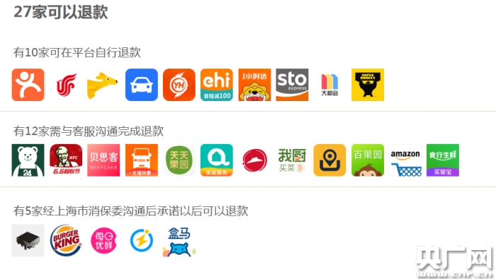12家需與客服溝通完成退款,分別是泰笛生活、肯德基、貝思客、貨拉拉、天天果園、阿姨幫、必勝客、我廚買菜、神州專車、百果園、亞馬遜、食行生鮮。5家經(jīng)上海市消保委溝通后承諾以后可以退款,分別是漢堡王(微信公眾號)、每日優(yōu)鮮、閃送、盒馬、21CAKE。