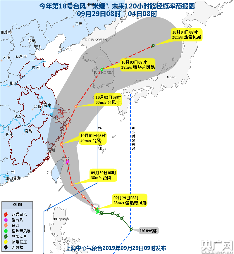 上海中心氣象臺(tái)今天09時(shí)發(fā)布臺(tái)風(fēng)“米娜”預(yù)計(jì)路徑圖(央廣網(wǎng)發(fā) 上海中心氣象臺(tái)供圖)