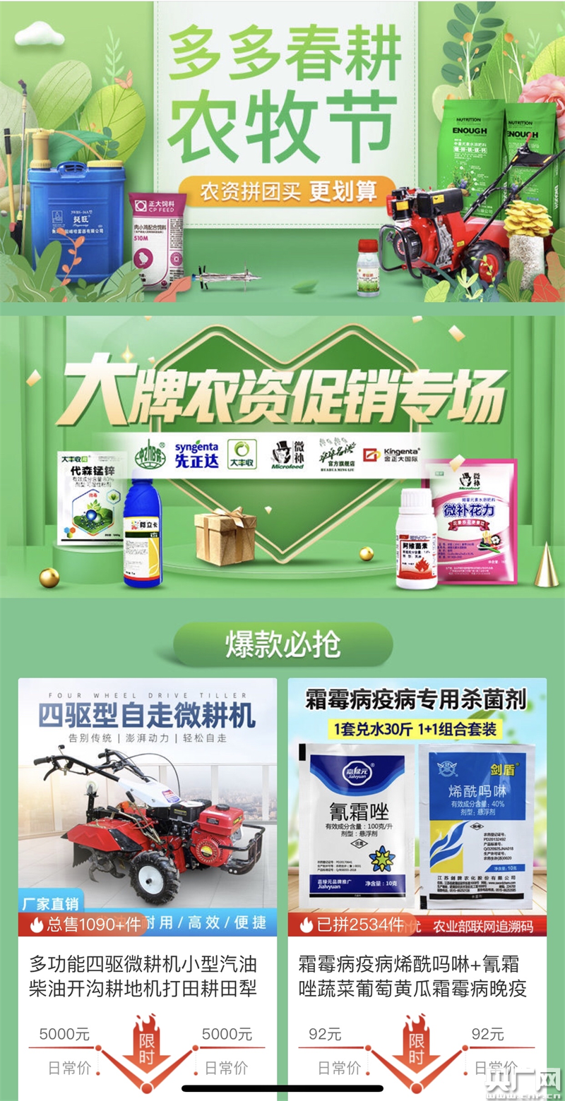 據(jù)悉,針對(duì)“春耕節(jié)”需求,拼多多已經(jīng)先期劃撥了3億元專項(xiàng)補(bǔ)貼資金,如下行規(guī)模超預(yù)期,平臺(tái)將進(jìn)一步追加補(bǔ)貼力度。