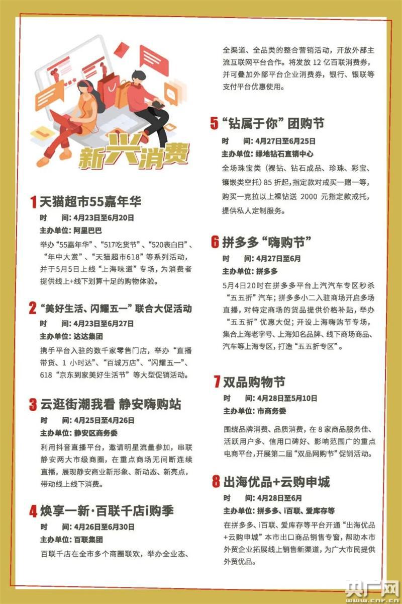 新興消費(fèi)方面,將推出近30項(xiàng)重點(diǎn)活動(dòng),如阿里巴巴將打造“55聚劃算匯聚上!睂贂(huì)場,開展打折、發(fā)放大額優(yōu)惠券等讓利活動(dòng),涉及1000家本地生活品牌、42萬家淘寶天貓上海商家。