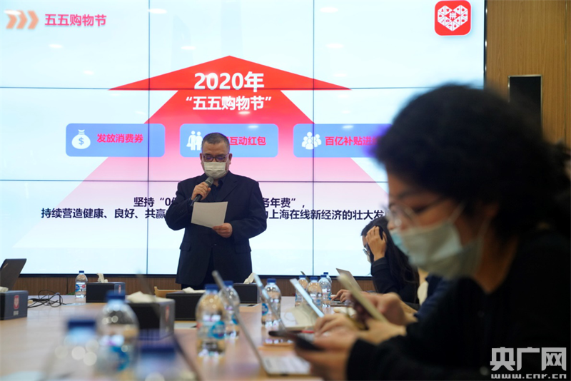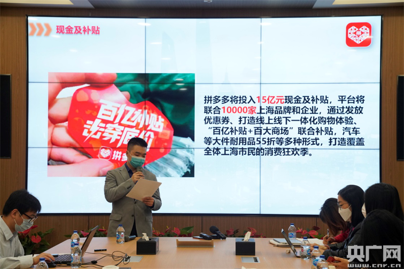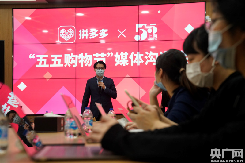 4月23日,拼多多宣布,將投入15億元現(xiàn)金及補貼,聯(lián)合10000家上海品牌和企業(yè),全力支持上海市“五五購物節(jié)”。拼多多高級副總裁王堅正在介紹平臺助力“五五購物節(jié)”的具體舉措。(本文圖片:央廣網(wǎng)發(fā) 李勝 攝)
