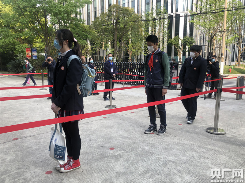 記者在上海市市東實(shí)驗(yàn)學(xué)?吹,按照學(xué)校規(guī)定,高三和初三學(xué)生分時(shí)進(jìn)校, 7:20~7:30 是高三年級(jí)的學(xué)生進(jìn)校,7:30~7:40 初三學(xué)生進(jìn)校。 進(jìn)入學(xué)校,地面上每一米會(huì)有一個(gè)紅色圓點(diǎn),學(xué)生保持一米間距排隊(duì)入校,然后測(cè)體溫。