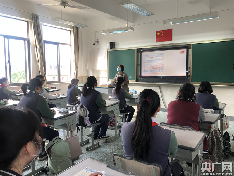開學(xué)第一課是防疫教育。記者在初三二班旁聽,任課老師講的是《最美逆行者》。教室里的學(xué)生也每人一個(gè)座位,前后左右都有一米左右間距。 為了教室足夠空間,書包柜移至走廊,保證學(xué)生上課間距。