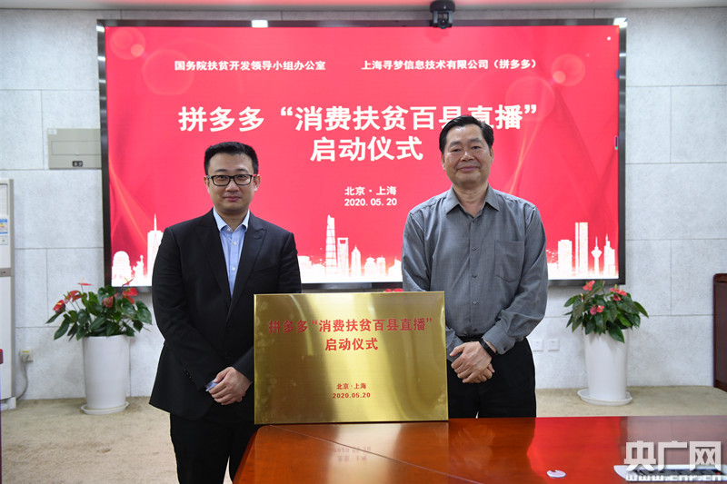 國務(wù)院扶貧開發(fā)領(lǐng)導(dǎo)小組辦公室副主任洪天云和拼多多聯(lián)合創(chuàng)始人范潔真共同啟動“消費(fèi)扶貧百縣直播行動”(央廣網(wǎng)發(fā) 劉宇攝)