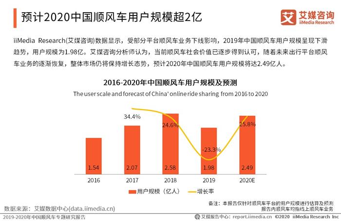 iiMedia Research(艾媒咨詢)數(shù)據(jù)顯示,受部分平臺順風(fēng)車業(yè)務(wù)下線影響,2019年中國順風(fēng)車用戶規(guī)模呈現(xiàn)下滑趨勢,用戶規(guī)模為1.98億。艾媒咨詢分析師認(rèn)為,順風(fēng)車憑借價(jià)格實(shí)惠、舒適便捷、共享環(huán)保的優(yōu)勢滿足用戶個(gè)性、多元的出行需求。隨著順風(fēng)車行業(yè)安全建設(shè)的推進(jìn)及平臺服務(wù)的升級,在不同生活場景下,用戶對順風(fēng)車的需求日益增多。當(dāng)前順風(fēng)車社會(huì)價(jià)值已逐步得到認(rèn)可,隨著未來出行平臺順風(fēng)車業(yè)務(wù)的逐漸恢復(fù), 整體市場仍將保持增長態(tài)勢,預(yù)計(jì)2020年中國順風(fēng)車用戶規(guī)模將達(dá)2.49億人。