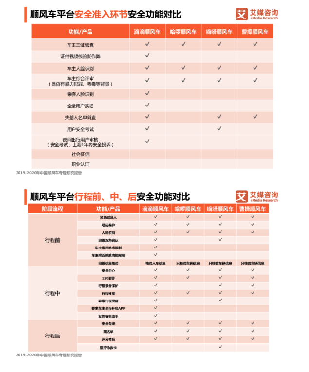 2019年11月20日起,滴滴順風(fēng)車重新恢復(fù)業(yè)務(wù)。滴滴順風(fēng)車在下線后進(jìn)行了安全升級,更迭了24個(gè)版本,優(yōu)化了374項(xiàng)功能。滴滴順風(fēng)車永久下線個(gè)性化頭像、性別、長文評價(jià)標(biāo)簽,僅展示與出行相關(guān)如“準(zhǔn)時(shí)、禮貌”等,并新增動(dòng)態(tài)視頻驗(yàn)證防作弊、信息核驗(yàn)卡、引入失信人名單篩查以及夜間出行安全防護(hù)等特色安全功能、產(chǎn)品。整體而言,滴滴順風(fēng)車在安全準(zhǔn)入以及行程前、中、后各環(huán)節(jié)上都布局了較為完善的安全產(chǎn)品、功能。