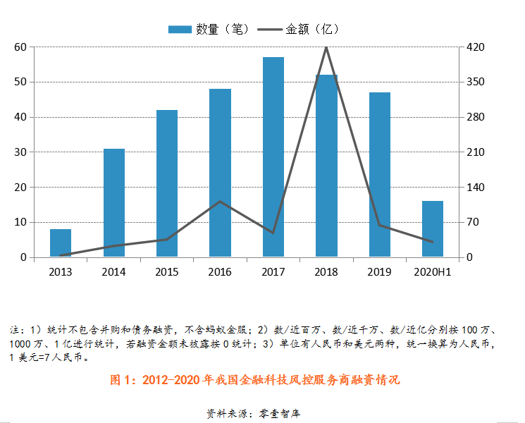 據(jù)報(bào)告數(shù)據(jù)顯示,2013-2019年間我國(guó)金融科技風(fēng)控廠商融資事件數(shù)整體呈逐年上升的趨勢(shì),2017年達(dá)到峰值,融資事件為57起;但從2018年開(kāi)始,連續(xù)兩年出現(xiàn)下滑趨勢(shì),2019年融資事件數(shù)為47起。融資金額整體呈現(xiàn)增長(zhǎng)趨勢(shì),2018年披露事件的融資總額最高,為418.6億元,2019年融資金額為63.5億元。