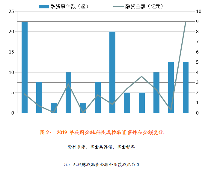 2019年上半年的融資事件數(shù)量為21起,下半年為26起,融資事件數(shù)量較多的月份分別為1月、7月、10月和12月,其中1月份達(dá)到最高峰,融資事件數(shù)為9起。在融資金額上,2019年4月同盾科技完成了1億美元的D輪融資,8月玖富數(shù)科登陸納斯達(dá)克,12月金融壹賬通于紐約證券交易所掛牌上市。