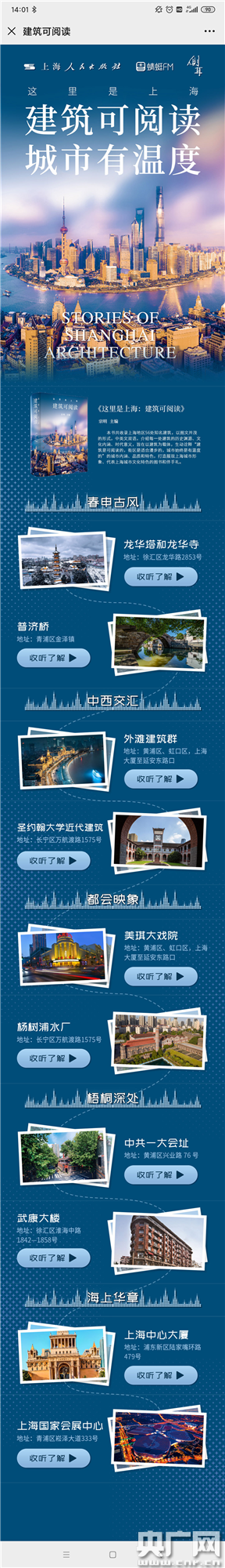 作為“建筑可閱讀”文旅融合工作的重點項目,上海城市推廣中心出品的《這里是上海:建筑可閱讀》已于今年上海書展期間隆重亮相。《這里是上海:建筑可閱讀》有聲版也于今天首發(fā)。由有聲版邀請了“側(cè)耳”團(tuán)隊印海蓉、施琰、陶淳、王幸、林牧茵、徐惟杰、臧熹和葉子龍等八位滬上知名的新聞主播、主持人參與錄制,讓上海的知名建筑可見、可讀、可聽,為廣大讀者帶來全新的視聽體驗。