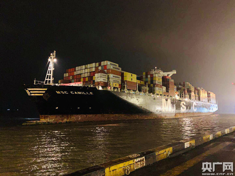 載運(yùn)進(jìn)博會(huì)展品龍門機(jī)床的巴拿馬籍“地中海卡米爾”輪靠泊洋山港三期碼頭。(央廣網(wǎng)發(fā) 楊大勇攝)