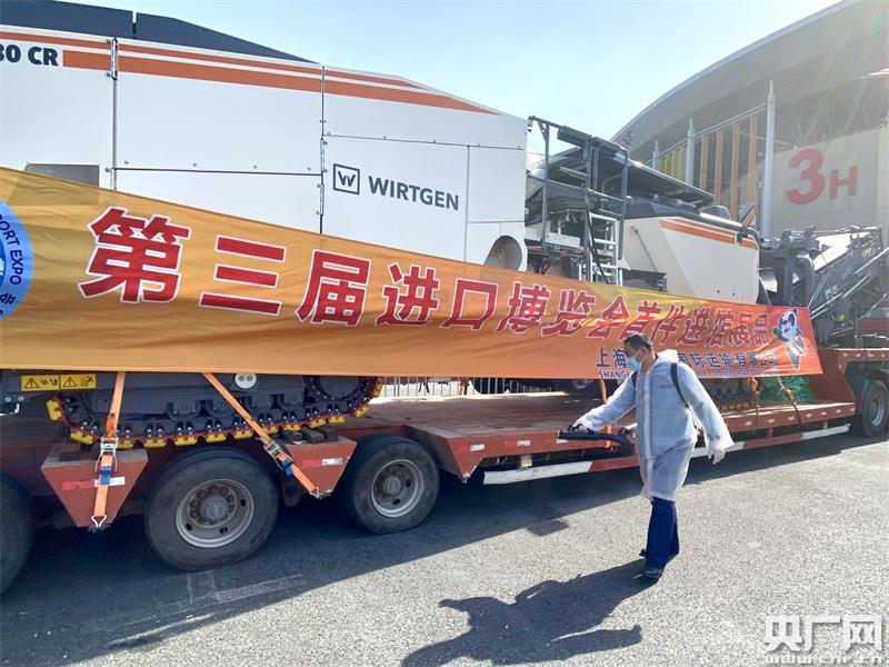 前期分拆運入現(xiàn)場的首件展品維特根道路就地冷再生設(shè)備(央廣網(wǎng)記者 唐奇云 攝)