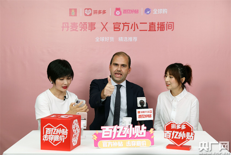 6月20日,丹麥駐滬總領(lǐng)事館商務(wù)領(lǐng)事杰仕伯·海利(中)進(jìn)入拼多多“百億補(bǔ)貼”直播間,推介了數(shù)十款來(lái)自丹麥的精選好貨。