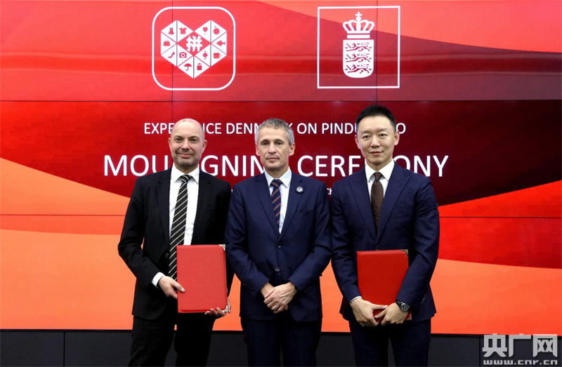 11月5日,丹麥王國(guó)駐上?傤I(lǐng)事館與新電商平臺(tái)拼多多達(dá)成合作,丹麥駐滬總領(lǐng)事林朗(左)與拼多多高級(jí)副總裁少昊(右)在丹麥駐華大使馬磊(中)的見(jiàn)證下簽署諒解備忘錄(本文圖片:央廣網(wǎng)發(fā) 安瞬 攝)