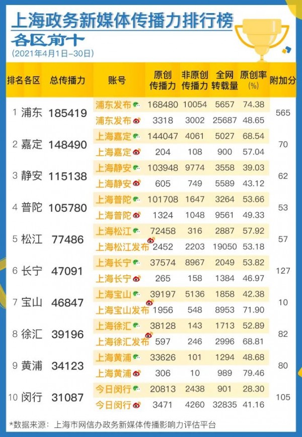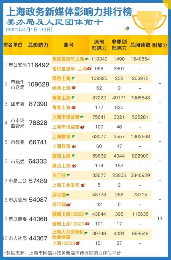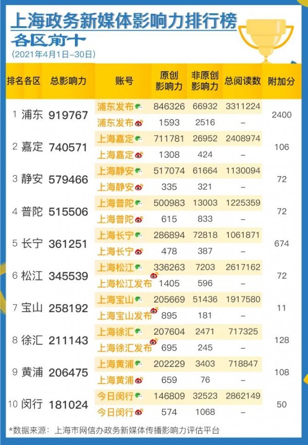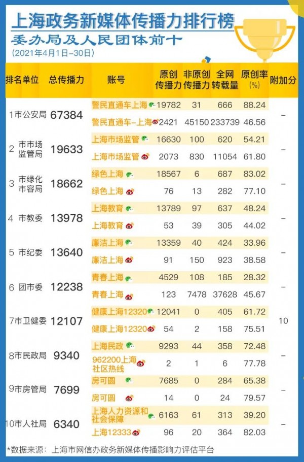 榜單由上海市委網(wǎng)信辦與上海市政府新聞辦公室聯(lián)合發(fā)布。數(shù)據(jù)來源于上海市委網(wǎng)信辦自主研發(fā)的“政務(wù)新媒體傳播影響力評估平臺”,目前該平臺覆蓋全網(wǎng)各渠道,納入了276個(gè)新聞客戶端、251家新聞網(wǎng)站、1200萬微信公眾號、3億多微博賬號的數(shù)據(jù)。