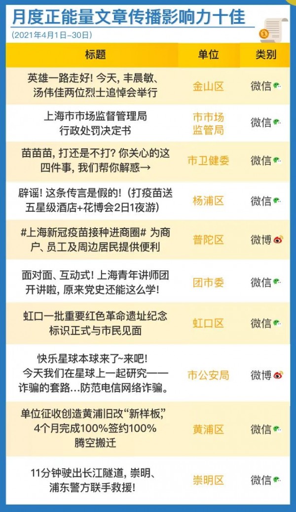 本月正能量十佳稿件中,金山區(qū)致敬消防“逆行英雄”;市市場監(jiān)管局教科書式“行政處罰書”獲網(wǎng)友點(diǎn)贊;市衛(wèi)健委就新冠疫苗接種問題為群眾解疑答惑,楊浦區(qū)及時(shí)澄清有關(guān)疫苗接種謠言,普陀區(qū)發(fā)布疫苗接種便民信息;團(tuán)市委、虹口區(qū)圍繞黨史學(xué)習(xí)教育開展宣傳,營造紅色學(xué)習(xí)氛圍;市公安局借助名人效應(yīng)擴(kuò)大防范網(wǎng)絡(luò)詐騙傳播效果;黃浦區(qū)公布近期舊改情況,推動精細(xì)化管理;崇明區(qū)刊發(fā)暖新聞,點(diǎn)贊城市正能量,均獲得網(wǎng)上較高關(guān)注。