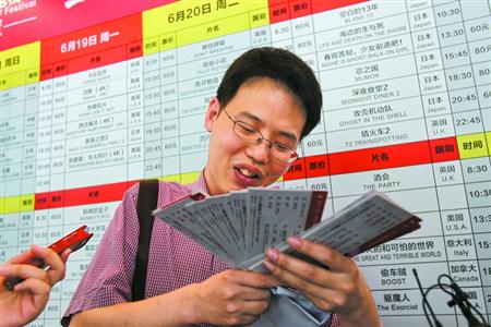 影城的工作人員也在現(xiàn)場(chǎng)隨時(shí)為影迷發(fā)放電影節(jié)排片表和購(gòu)票單,F(xiàn)場(chǎng)前來(lái)買票的影迷表示,可以利用排隊(duì)時(shí)間先選擇好影片,并在購(gòu)票單上填好影片編號(hào)和購(gòu)票數(shù)量,這樣就能在最快時(shí)間內(nèi)買到心儀的電影票。