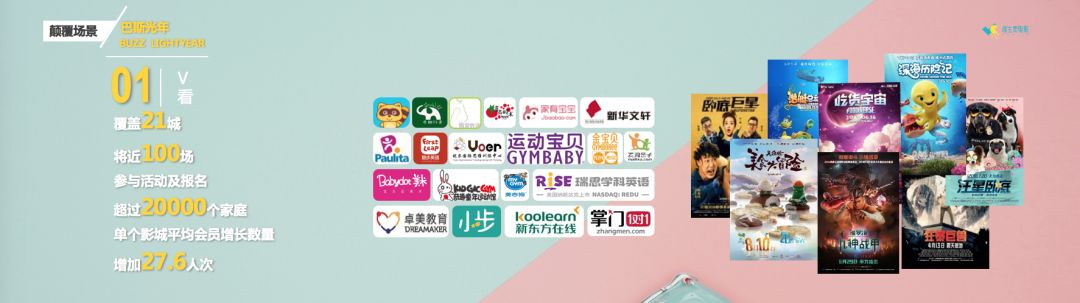 比如巴斯光年計劃的V看活動,針對有小孩的家庭,合作的品牌有運動寶貝、新東方、卓美教育等,發(fā)起半年內(nèi)已經(jīng)舉辦將近100場,有超20000個家庭報名,單個影城平均會員增長數(shù)量27.6人。
