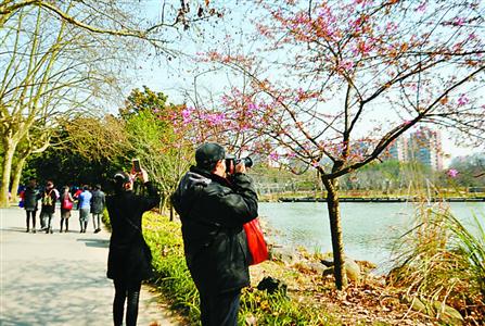 朱繼軍說,目前園內(nèi)的寒櫻已基本謝幕,本周末河津櫻將成主角,預(yù)計上海植物園內(nèi)一半以上的河津櫻都會綻放,進入最佳觀賞期,而且觀賞期最長可以持續(xù)到3月初。其他最近進入觀賞期的櫻花還有鐘花櫻、大漁櫻、修繕寺寒櫻等。近期持續(xù)較長時間的較高溫度和光照,是部分早櫻品種早綻放的主要原因。
