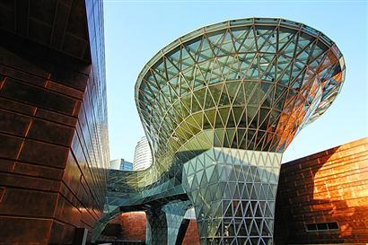代表未來、開放和瞬間的“歡慶之云”,則帶給整棟建筑一種通透靈動感。整朵“云”由3730塊三角玻璃組成,三根“云柱”撐起的空中走廊連接陳列展覽、公共服務(wù)和屋頂花園等功能區(qū)。走進(jìn)“云廳”內(nèi)部才發(fā)現(xiàn),盡管墻壁包括扶手都是透明玻璃構(gòu)成,下面卻是“腳踏實(shí)地”,并不用擔(dān)心恐高!霸茝d”為觀眾提供極佳的黃浦江觀景平臺,同時(shí)也將用于舉辦讀書會、講座等各種互動活動。穿過“云廳”,還有東西兩個(gè)屋頂花園,目前仍在建設(shè)中,它們將分別是中式古典園林和西式花園。此外,博物館門前的160余個(gè)旗桿由原上海世博會遷來,開館后將用于懸掛國際展覽局成員的旗幟,這也是目前在上海唯一的“萬國旗林”。