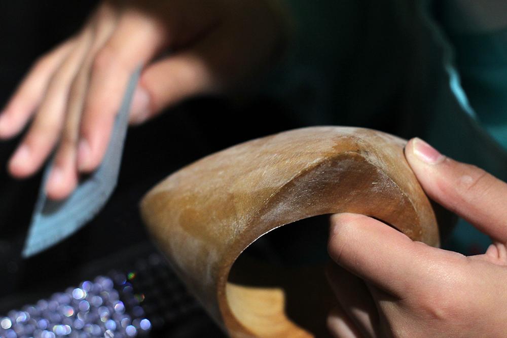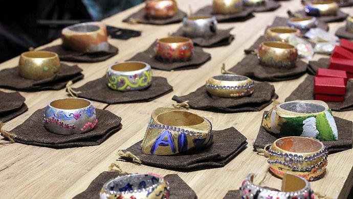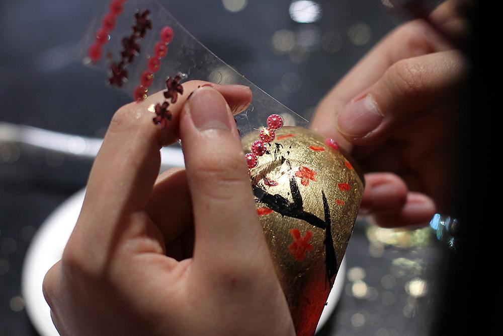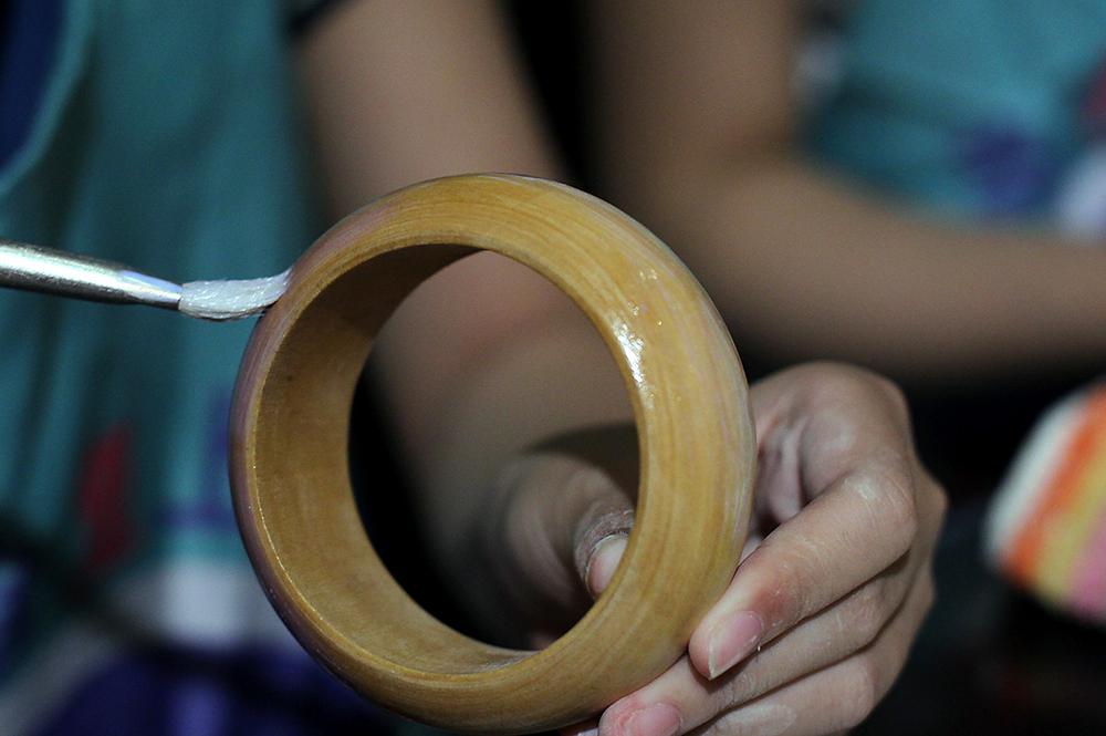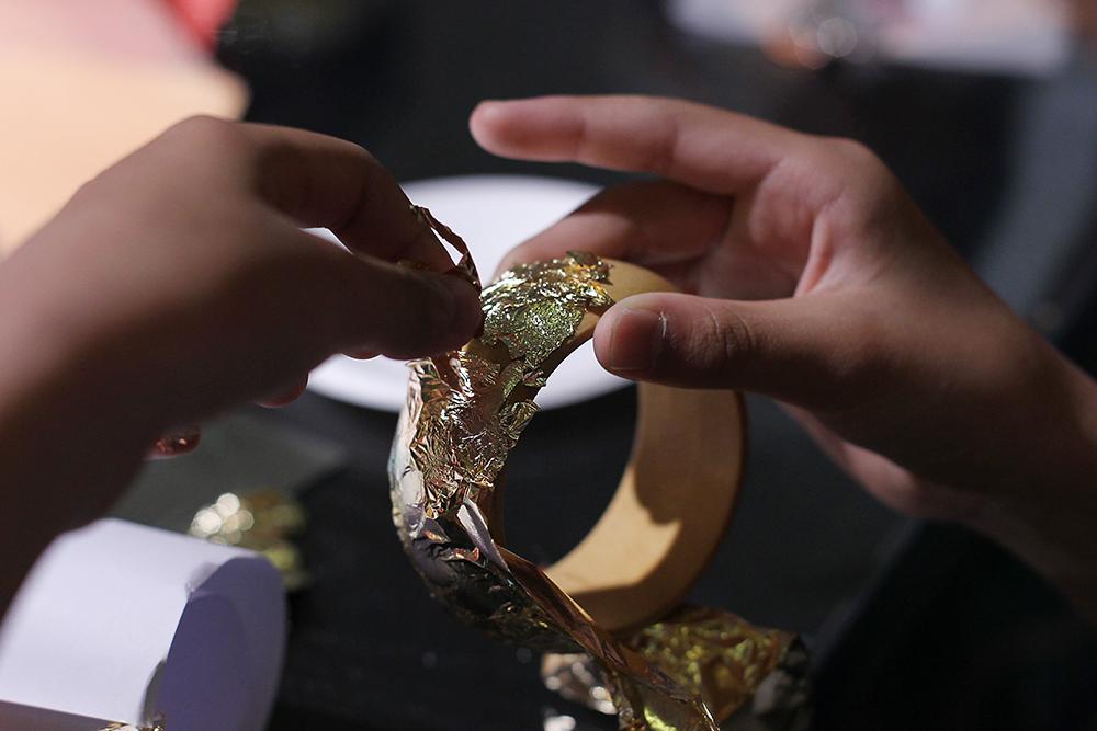 在中國歷史剛剛走出青銅器的神秘與凝重,而瓷器尚未成為萬眾矚目的“中國面孔”之前,漆器以其明艷絢麗的裝飾性和廣泛的實(shí)用性盛極一時(shí)。從秦漢的彩繪到唐代的螺鈿鑲嵌、金銀平脫,從宋元的剔犀、剔紅、戧金再到明清各種復(fù)合性制作工藝層出不窮,漆器的使用幾乎涵蓋了社會生活的方方面面。在“大漆司器——源于生活的漆器藝術(shù)展”中,除了漆器工藝品外,也有不少生活器具。項(xiàng)軍一邊看著孩子們往木手鐲上小心翼翼地貼金箔,一邊向解放日報(bào)·上觀新聞記者介紹,通過體驗(yàn)活動希望孩子們能對漆器有一個(gè)基本認(rèn)識,漆器和人們生活息息相關(guān),除了實(shí)用功能外,也可以做出各種藝術(shù)效果。