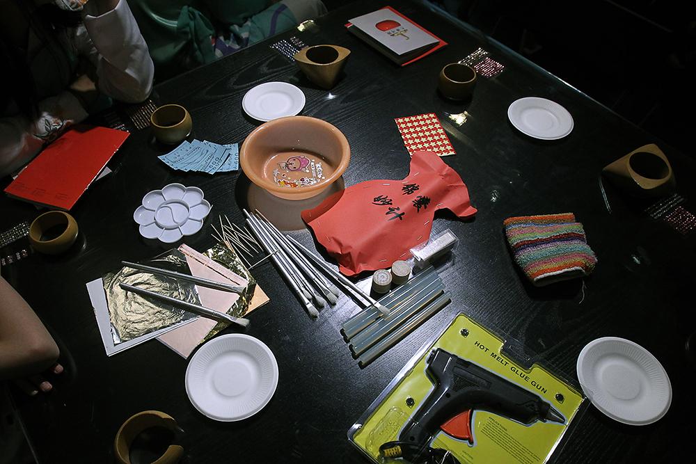 為了保證安全,課堂上使用了環(huán)保漆,工藝則是傳統(tǒng)的。先在打磨光滑的木質(zhì)手鐲上打上一層底漆,用吹風(fēng)機(jī)吹干,用金箔紙將木質(zhì)手鐲的每一部分都包裹住,在上面彩繪出自己喜歡的圖案,涂上保護(hù)層。在每張桌子上,都放著一個(gè)“錦囊妙計(jì)”,這是指導(dǎo)教師李莉特意設(shè)計(jì)的!靶∨笥岩鲆粋(gè)小時(shí),怕他們忘記步驟,可以打開錦囊妙計(jì)查看!背隋\囊外,李莉還特意要求孩子們盡量穿著傳統(tǒng)服飾,美術(shù)館課堂里,有人穿著旗袍,有人穿漢服,有的孩子還特意搭配了古典的發(fā)飾,煞是好看。“漆器是非遺,也是中國傳統(tǒng)文化。穿著傳統(tǒng)服飾是為了讓他們做完后戴著手鐲留影,希望這能成為他們小學(xué)最后階段的美好回憶!崩罾蛘f。