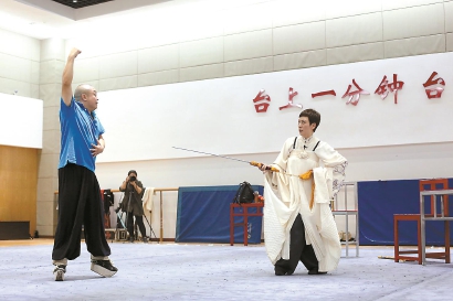 史依弘(右)和楊東虎排練《貞娥刺虎》。記者 蔣迪雯 攝