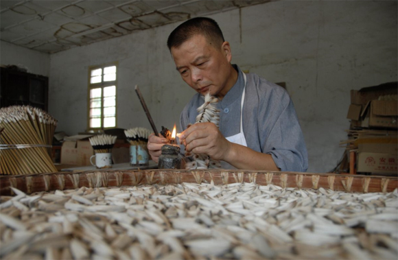 來(lái)自安徽涇縣的宣筆制作技藝吸引了不少游客。作為這一國(guó)家級(jí)非遺的傳承人,佘征軍介紹,自家世代制筆,到他這里已是第六代。目前有十幾個(gè)年輕人跟自己學(xué)藝,而自己也曾走入校園,向中小學(xué)生普及宣筆的制作方法!皣(guó)家對(duì)傳統(tǒng)文化的重視讓我們感覺(jué)到時(shí)代賦予的機(jī)會(huì),我們一定要牢牢把握,把宣筆制作技藝發(fā)揚(yáng)光大!辟苷鹘榻B,宣筆制作技藝源于秦代,盛于唐宋,迄今已有2000多年的歷史。以選毫精良、制作精密而著稱,具有裝潢雅致、毛純耐用、剛?cè)徇m中、尖圓齊健四德之美的獨(dú)特風(fēng)格。宣筆制作全為手工制作,以前大多是書(shū)畫藝術(shù)家們定制,或售往朵云軒等,現(xiàn)在借助互聯(lián)網(wǎng),宣筆已經(jīng)可以網(wǎng)上購(gòu)買!皶(shū)法是中華民族精神和文化的表達(dá),在最簡(jiǎn)約的層面上濃縮了中華文化的基本精神。因此,一支好的毛筆一直都是書(shū)法愛(ài)好者的追求!
