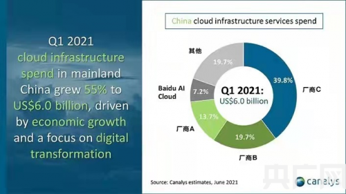 canalys報(bào)告顯示,在2021年第一季度,中國云計(jì)算市場(chǎng)規(guī)模達(dá)到60億美元,同比增長55%,占全球14%,是僅次于美國的全球第二大云計(jì)算市場(chǎng)。其中,百度智能云等四家云服務(wù)廠商合計(jì)市場(chǎng)份額超過80%。