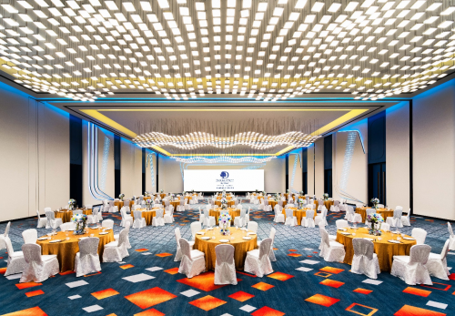 酒店設(shè)計極具現(xiàn)代感,通過流線型的室內(nèi)設(shè)計,以疾馳的跑車為設(shè)計靈感,巧妙地融合具有現(xiàn)代風(fēng)尚的賽車競技等元素,如客房的設(shè)計融入了星空燈、賽車跑道等元素,賓客可以充分體驗在賽道馳騁后安枕星河入夢的感覺;宴會廳內(nèi)海浪型LED燈搭配賽車競技元素的LED燈帶,燈光可根據(jù)宴會不同的主題色調(diào)隨之調(diào)整變化,帶給賓客視覺與感官的愉悅享受。