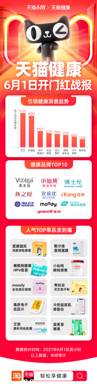 6月1日,阿里健康旗下的天貓健康平臺(tái)迎來(lái)“6·18”開(kāi)門(mén)紅。開(kāi)場(chǎng)1小時(shí),靈芝、失眠貼(器械)、冬蟲(chóng)夏草、燕窩滋補(bǔ)品、宮頸癌疫苗等健康熱門(mén)品類(lèi)訂單大漲,同比增長(zhǎng)分別達(dá)972%、809%、321%、255%、201%。