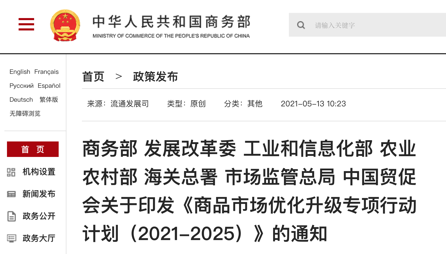 央廣網(wǎng)北京5月13日消息(記者 張圣琪)據(jù)商務(wù)部網(wǎng)站5月13日消息,為深入貫徹落實《中共中央國務(wù)院關(guān)于新時代加快完善社會主義市場經(jīng)濟體制的意見》《中共中央辦公廳國務(wù)院辦公廳關(guān)于印發(fā)<建設(shè)高標(biāo)準(zhǔn)市場體系行動方案>的通知》等文件精神,推進商品市場創(chuàng)新發(fā)展,暢通國內(nèi)大循環(huán),促進國內(nèi)國際雙循環(huán),商務(wù)部、發(fā)展改革委、工業(yè)和信息化部、農(nóng)業(yè)農(nóng)村部、海關(guān)總署、市場監(jiān)管總局、中國貿(mào)促會聯(lián)合制定了《商品市場優(yōu)化升級專項行動計劃(2021-2025)》(下稱“《行動計劃》”)。