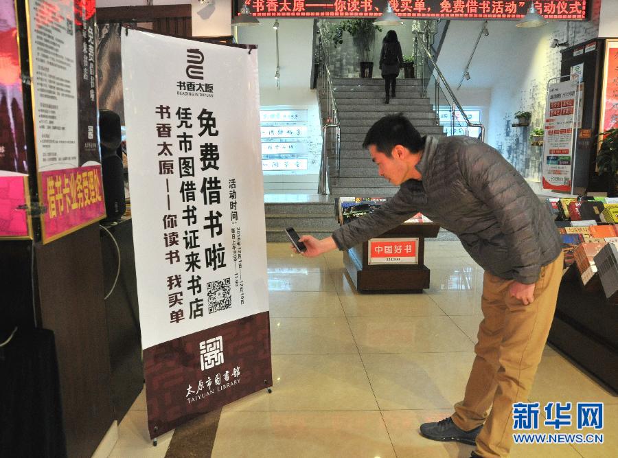 12月1日,一位讀者在掃描二維碼了解借書信息。在書店選中心儀的圖書,可直接把書借回家,不用花一分錢!這是由太原市文化局主辦的“你讀書、我買單”免費(fèi)借書活動(dòng);顒(dòng)將從1日持續(xù)到10日,每天上午9時(shí)到11時(shí),在太原書城和山西圖書大廈同步開展。新華社記者 王菲菲 攝