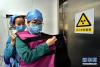5月11日,山西省太原市中心醫(yī)院心內科導管室護士張娣(前)在同事的幫助下穿著鉛衣。 -