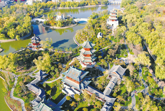 10月23日,金秋艷陽下太原迎澤公園亭、臺、樓、閣錯(cuò)落有致,宛如一幅古韻山水畫。近日,迎澤公園西南角二期續(xù)建項(xiàng)目完工開放,此次開放的五峰插云景區(qū)仿古建筑群及悅園,主要建筑將被用作展館,陳列各式作品及花卉展覽等,以供游人觀賞休憩。