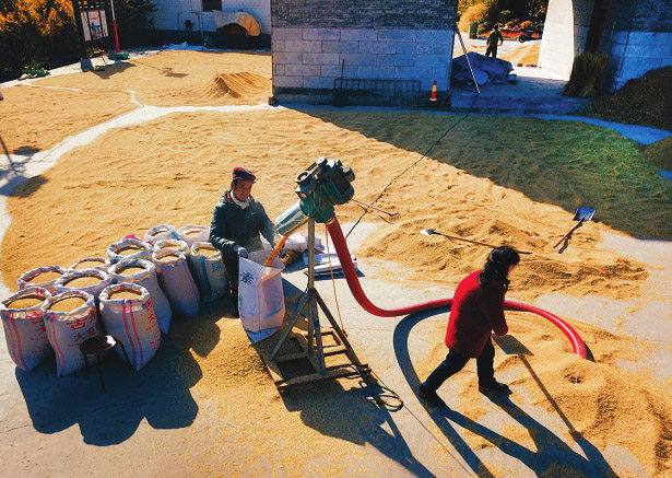 赤橋村村頭,金秋稻米打場成為古村一景。