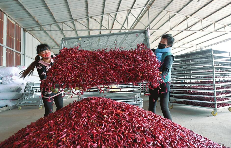 11月14日,在襄汾縣趙康鎮(zhèn)晉綠三櫻椒專業(yè)合作社,村民在晾曬辣椒。近年來,襄汾縣通過“公司+合作社+農(nóng)戶”的模式,推動(dòng)辣椒產(chǎn)業(yè)提質(zhì)升級(jí)。目前,該縣辣椒種植面積超過2萬畝,種植戶人均增收2000余元。