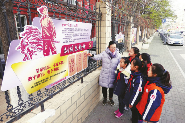 12月3日,社區(qū)志愿者正向太原市濱河小學的小學生講述“劉胡蘭精神”。為了提高社區(qū)文化氛圍,太原市迎澤區(qū)勁松社區(qū)在濱河小學附近的桃園南路西一巷,創(chuàng)建了百米長的“紅色精神”文化長廊。