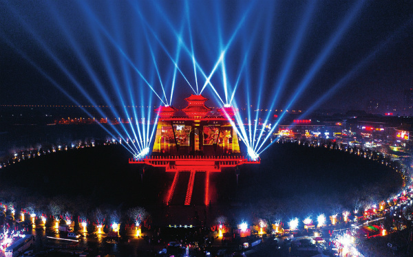 2月11日,“華人老家,幸福臨汾”主題光影秀將夜晚的臨汾裝點得流光溢彩、如夢如幻。(閆銳鵬攝)