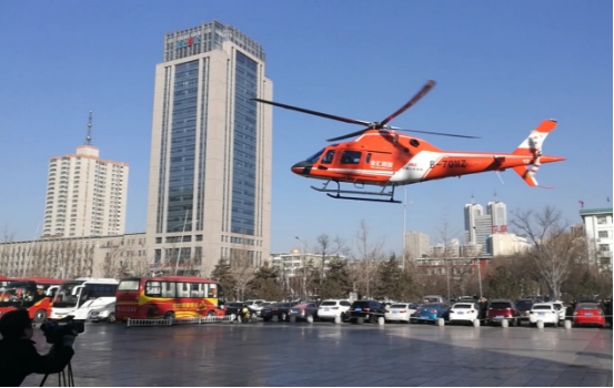 2月7日上午10時許,一架橘紅色空中救援直升機徐徐降落在太原市南宮廣場,醫(yī)務(wù)人員迅速將“車禍傷者”抬上直升機……