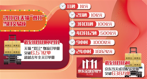 蘇寧易購也宣布,11日8時52分,全渠道銷售打破去年“雙11”全天紀錄,截至12時,蘇寧全渠道增長182%,其中,線上增長227%。