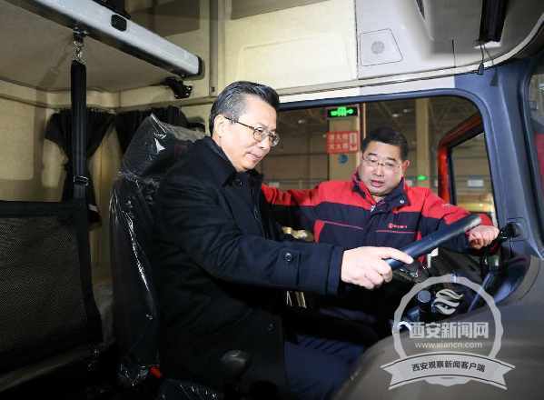 西安市委書記王永康在陜汽集團(tuán)生產(chǎn)線詳細(xì)了解生產(chǎn)銷售、技術(shù)研發(fā)、車輛調(diào)試情況,詢問新能源汽車的生產(chǎn)工藝、市場占有率,并饒有興致地登上重卡體驗舒適度 (西安日報 記者 李欣攝)