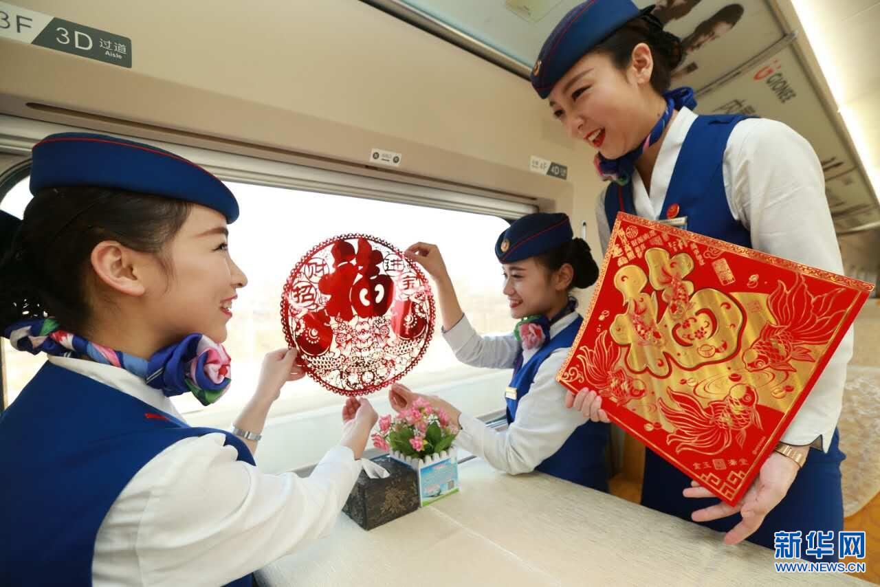 1月12日,春運前一天,西安客運段的乘務(wù)員們?yōu)榱私o車廂營造出暖暖的年味兒,購買了窗花、對聯(lián)、福字等節(jié)日喜慶物品裝飾車廂,讓春運期間回家過年的旅客一邁進車廂便能感受到濃郁的年味氣息。同時,他們還組織開展了“迎新春、送福字”活動,讓旅客帶;丶,與家人共度新春佳節(jié)。(通訊員 王曙天) -