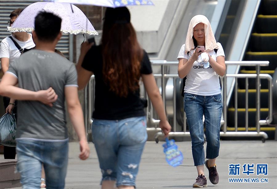 7月3日,西安街頭一名市民用毛巾遮頭抵擋陽光照射。 陜西持續(xù)高溫天氣,西安、寶雞、安康等多地發(fā)布高溫預(yù)警。據(jù)最新預(yù)報顯示,今明兩天陜西大部分地區(qū)仍以晴到多云為主,關(guān)中南部和陜南東部部分地方還將出現(xiàn)35℃以上的高溫天氣,其中關(guān)中南部最高氣溫可達38℃至40℃,“燒烤”模式持續(xù)。新華社記者 劉瀟 攝