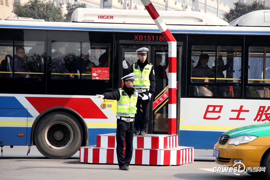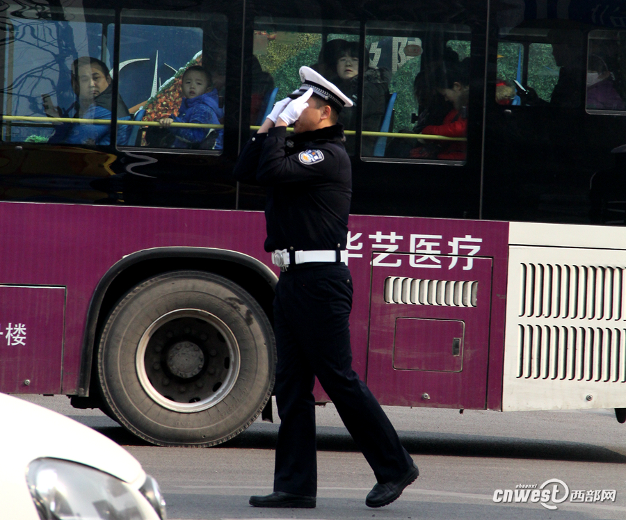 公交車?yán)锏某丝拖蚵房趫?zhí)勤的交警注目。