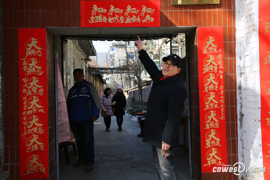 西部網(wǎng)訊(記者魏永賢) 2月3日,西安文藝北路,64歲的對(duì)聯(lián)達(dá)人郭增發(fā)在家屬院大門口掛出18個(gè)狗(犬)72字的狗年創(chuàng)意套字春聯(lián),上聯(lián)是“犬呼佳音”“犬傳福音”“犬喚春來”“犬守盛世”“犬鬧春風(fēng)”“犬兆豐登”“犬報(bào)平安”;下聯(lián)是“犬臥福門”“犬護(hù)福宅”“犬聲遠(yuǎn)揚(yáng)”“犬來旺旺”“犬唱迎客”“犬踏山河”“犬迎五!保粰M批 “狗踏春梅”“狗犬報(bào)春”“狗唱雞鳴”“狗年大吉”。